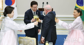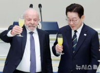 이재명 대통령과 루이스 이나시우 룰라 다시우바 브라질 대통령이 23일 청와대에서 열린 국빈 방한 환영 만찬에서 건배하고 있다. [연합]